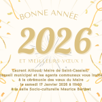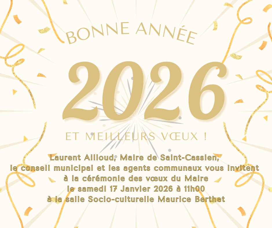Laurent AILLOUD, Maire de Saint-Cassien,le Conseil Municipal et les agents communaux,vous invitent à la cérémonie des vœux du Mairele samedi 17 janvier 2026 à 11h00à la salle Socio-culturelle Maurice Berthet. Bonne année 2026 et meilleurs vœux.