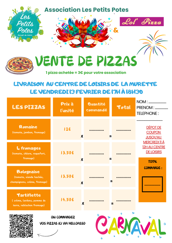 Vente de pizzas du vendredi 13 février 2026 organisée par Les Petits Potes et Lol’Pizza.