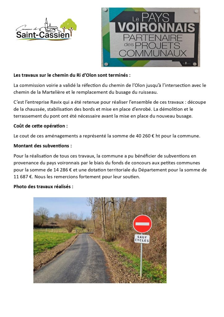 - Chemin de l’Olon : La chaussée du chemin de l’Olon a été rénovée et le busage de l’Olon remplacé.